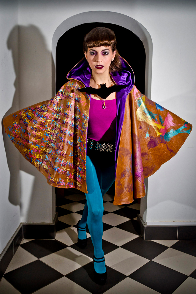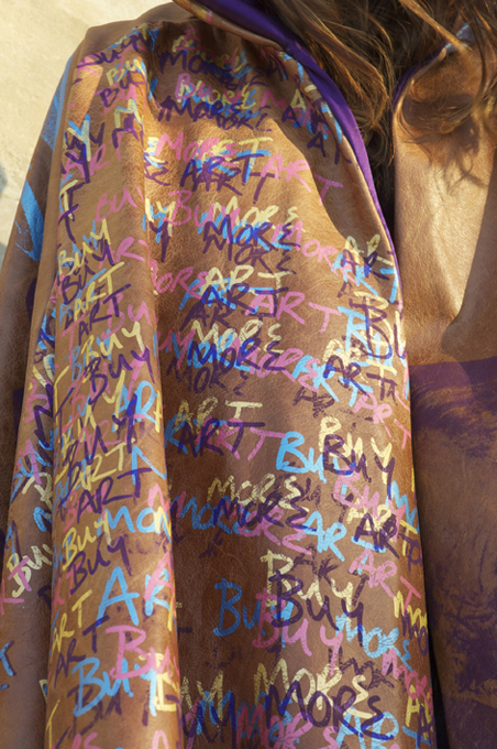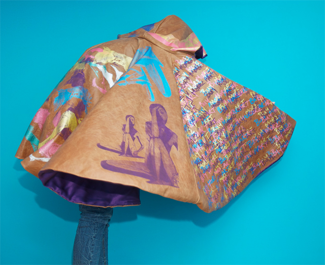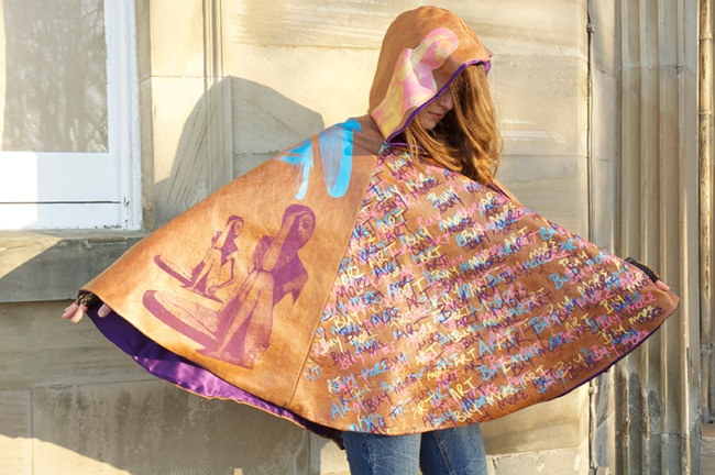 Shauna has created a screen-printed cape inspired by the work of F.E McWilliams'. Pushing the barriers of print into the 3 dimension, she wanted to create a piece that would change shape and form when worn and in motion. The surface design reflects the silhouettes and form and the suggestion of movement that is alive within F.E McWilliams' work. Women of Belfast, the expressive works that capture the fragility of life, particularly inspired Shauna. As F.E McWilliams' work was so driven by movement, Shauna was inspired by the idea of creating a piece of art which could then become variable when worn, communicating the idea in motion.